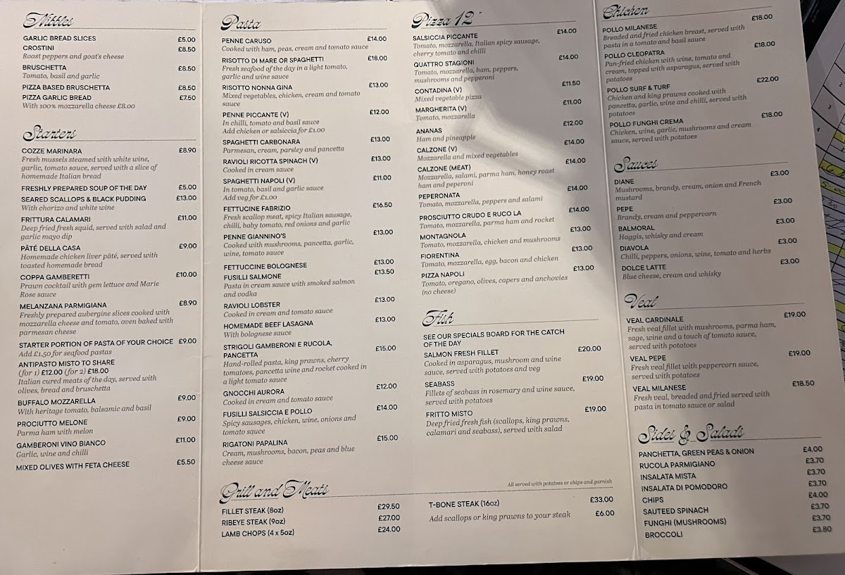 Starters like seared scallops with black pudding and melon with prosciutto set the tone for a leisurely meal, while pasta options such as lobster ravioli, seafood spaghetti, and spaghetti carbonara invite you to enjoy familiar, rich flavors that pair naturally with a glass of their carefully selected wines. For those seeking heartier fare, dishes like veal, meat calzone, or sirloin steak offer robust choices that complement the welcoming atmosphere.